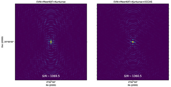 To populate the measurement sets with visibilities, the MeqTrees [24] software is used to simulate a sky model with two point sources: a 1 Jy point source at the phase centre and a far-field point source with 5 Jy brightness located at 6 arcmin from the phase centre. The 1 Jy point source at the phase centre represents our source of interest for which we want to measure its . This source is simulated at the phase centre to limit the amplitude attenuation or the effect of smearing so that one can estimate the effectively from the simulation. In the VLBI regime, a source at 6 arcmin is already a far-field source and, therefore, can be used to measure the contamination, , at the phase centre. MeqTrees is used to corrupt the simulated visibility data with 1 Jy Gaussian noise per visibility. The WSclean imager [26] is then used to translate the visibilities to the image using uniform weighting, as shown in Figure 6, where a few pixels are imaged to visualise only the single source at the phase centre. The left panel and the right panel of Figure 6 show the 1 Jy point source as seen by the EVN + MeerKAT + Kuntunse and EVN + MeerKAT + Kuntunse + ECCAS telescopes, respectively. It is easy to see from this result that the point source sidelobes as seen by the EVN + MeerKAT + Kuntunse + ECCAS telescope are lower compared to the sidelobes of the same source as seen by the EVN + MeerKAT + Kuntunse telescope: this is a straightforward result from sampling more Fourier coefficients in the -plane. We also note that the resolution of both images in Figure 6 does not vary (i.e., the size or shape of the source main lobe does not change): this is due to adding more antenna telescopes that do not increase the longest Fourier modes and, therefore, preserve the same resolution of the instrument. To estimate the of the source at the phase centre, we adopt the following procedures using uniform weighting:
