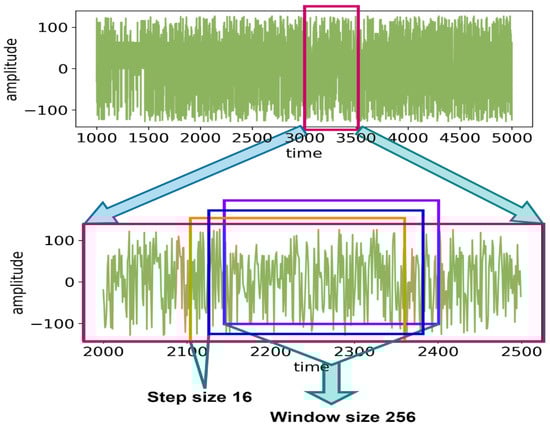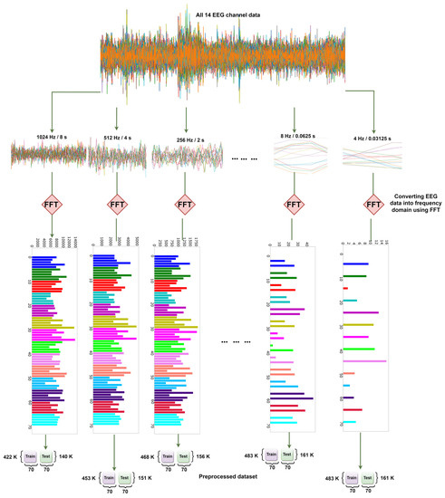 Figure 12. First, EEG data with 14 channels are selected, with different window sizes subsequently taken each time. Then, after applying FFT, the preprocessed dataset is ultimately created for that particular window size or time slice.