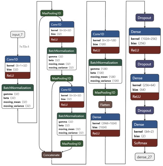 Figure 7. It has four convolution layers and three dense layers. Using FFT as feature extraction, the 1D CNN model is trained on two-class classifications for the valence label.