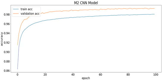 Table 12, a different combination of the train–test split set was tested. Each of the experiments was executed in Google Colab using the M2 model for 100 epochs. The required training and testing time is noted for each split. Wall time is the amount of time that a wall clock (or a stopwatch held in the hand) would indicate has passed between the beginning and end of the process. The amount of time spent in user code and the amount of time spent in kernel code are referred to as user-CPU time and system-CPU time, respectively. Among the options available for the train–test split, a 75/25 split attained the best test accuracy of 99.26%.