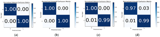 In the M2 + FFT + FE-3 experiment, all three ratings were used, achieving 99.22% and 97.80% testing accuracy for valence and arousal, respectively. The confusion matrix for the M2 + FFT + FE-3 experiment on the valence and arousal labels is shown in