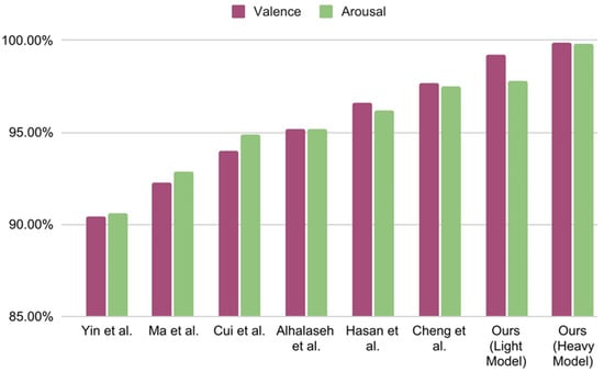 Figure 11 for visualizing the result. The proposed 1D CNN model with two convolution layers and one dense layer (the light model) achieves 99.22% and 97.80% test accuracy on valence and arousal, respectively, for binary classification. On the other hand, the 1D CNN model with four convolution layers and three dense layers (heavy model) achieve 99.89% and 99.83% testing accuracy on valence and arousal, respectively. This accuracy is highest even when compared to the other state-of-the-art works shown in