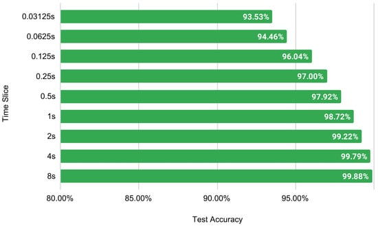 Figure 13. The time slice is directly proportional to the testing accuracy. The light model with two convolutions and one dense layer achieves a respectable 93.53% accuracy with a 0.03-s time slice of EEG data. It shows the possibility of using EEG data to recognize emotions in real-time. For the rest of the experiments, a window size of 256, or two-second time slice, is selected as it provides a balance between lower time slices without losing accuracy significantly.