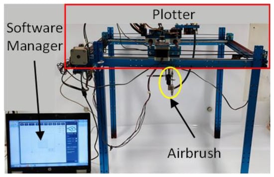 First, two 0.8 cm × 1 cm electrodes are deposited on a 100 µm thick mylar substrate with a silver-based paint. Second, copper wires are attached to each electrode, using a commercially available conductive epoxy glue. Finally, the portions of the electrodes bonded to the wires are masked off and the piezoresistive paint, loaded with 4.5 wt.% of GNPs, is sprayed over the substrate (Figure 1c) using an automated and remote-controlled XY plotter equipped with an airbrush with a 1.2 mm nozzle (Figure 2). The driving-software of the deposition system allows the motion and speed of the plotter, and consequently of the airbrush, to be controlled, tailoring the geometry and thickness of the realized coating. Thus, an active strain-sensitive area of 15.4 cm × 1 cm with a thickness of 70 µm and an overlapping area of 0.4 cm × 1 cm on each electrode is obtained, as shown in the sketch of Figure 3a.