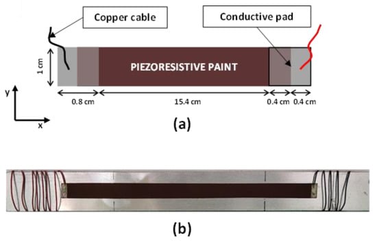 (a) Schematic representation of the piezoresistive sensor; (b) picture of the sensor realized on a mylar substrate glued onto an aluminum beam for the execution of the electromechanical tests.