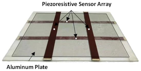 Picture of the grid constituted by the two orthogonal couples of piezoresistive sensors on an aluminum plate.
