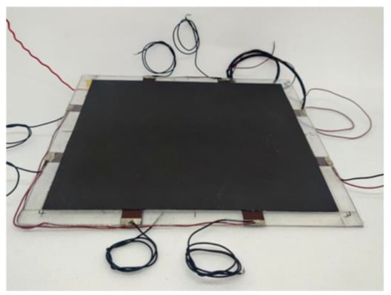 The sensing and EM-absorbing laminate (SEAL) that includes both the array of piezoresistive sensors and the RAS was assembled once the characterizations of the individual components, with respect to their specific functionality, was completed. As sketched in Figure 5, the two functionalized mylar sheets and the lossy sheet’s substrate constitute together the spacer (having an overall thickness ts) of the DSS configuration. The various layers were stacked and glued onto an aluminum plate (15 cm × 15 cm × 1 mm), used as a structural and electrically conductive substrate. The final panel is characterized by a total thickness tLS + ts + tback = 1.870 mm (see Section 3.4). Figure 6 presents a picture of the final produced structure.