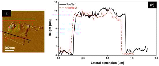 The thickness and lateral dimension of the GNPs were studied with atomic force microscopy (AFM) (Dimension Icon AFM, Bruker-Veeco), operating in tapping mode. Figure 7a shows an AFM image of the GNPs with their measured thickness profile (Figure 7b). According to the performed measurements, the produced GNPs had an average thickness of a few tens of nanometers, while the lateral dimensions were on the order of a few microns.