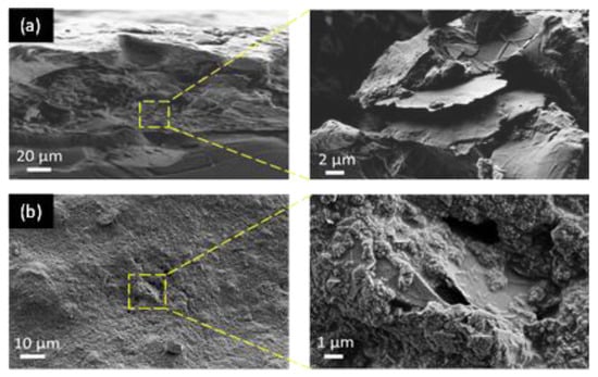 Furthermore, in order to demonstrate the good integration of the fillers within the polymer matrix, in Figure 9a,b we show the cross-section and the surface images of the produced samples obtained using the paint loaded at 4.5 wt.% of GNPs. As can be observed, the individual nanoplatelets are easily distinguishable.