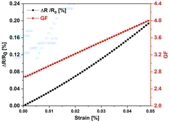 Figure 10 shows the relative percentage variation of the resistance and of the as a function of . A quasi-linear response was obtained for the former quantity as the strain increased up to 0.05%, with the sensor’s sensitivity reaching the maximum value of 4.