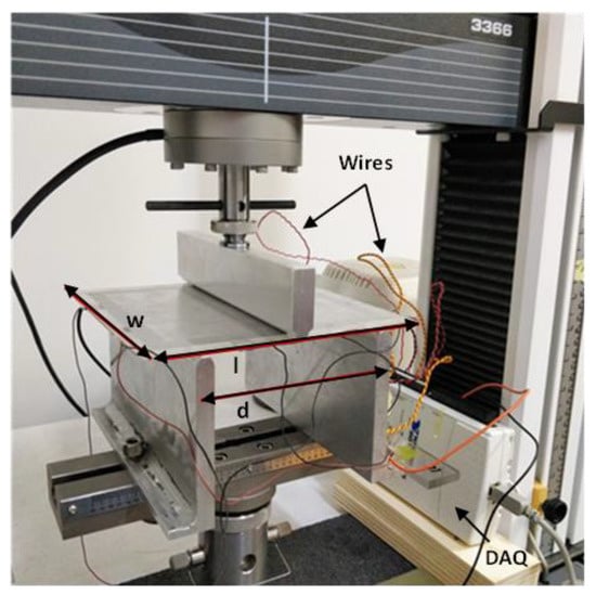 Set-up used to perform the different tests on the prototype with the array of strain sensors (w = 15 cm; l = 15 cm; d = 10 cm).
