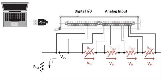 where is the voltage across the sensor measured by the DAQ and [A] is the current flowing through the series resistors.