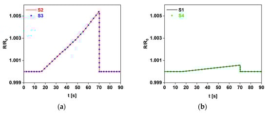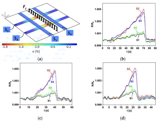 It should be noted that, as the sensors laying perpendicular to the load (S2 and S3) are subjected to a greater deformation than those parallel (S1 and S4), the latter manifested a much lower resistance variation during the mechanical tests. Moreover, due to the specific load and structure symmetries, the response of S1 (S2) was almost overlapping with that of S4 (S3). Finally, comparing Figure 13b–d, it can be seen that the resistance peaks of all the sensors were obtained at different moments in time because of the different crosshead speeds.