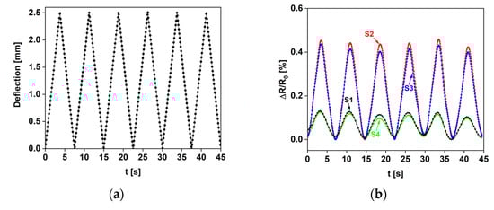 Finally, the dynamic and good repeatability responses of the sensors were assessed through the performing of a cyclic test: Figure 15a shows the deflection over time, whereas Figure 15b shows the corresponding relative resistance variations.