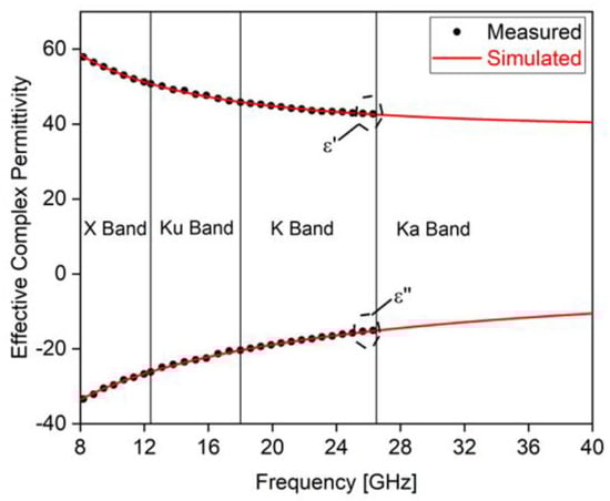 The electromagnetic properties of the paint loaded at 8 wt.% of GNPs, constituting the lossy sheet of the RAS, were investigated through a transmission/reflection-based method [38], i.e., by measuring with a two-port vector network analyzer the scattering parameters of the material specimens inserted in three different sets of rectangular waveguides. Specifically, WR90, WR62, and WR42 waveguide sections, with their proper calibration kits, were used to cover the X (8.2–12.4 GHz), Ku (12.4–18 GHz), and K (18–26.5 GHz) bands, respectively. Subsequently, by following the procedure described in [39,40], the effective complex permittivity ) of the thin coating vs. the frequency was extracted from the measurements. The results were then used to extend their values up to 40 GHz using the second-order Debye model [41]. Figure 16 shows the real and imaginary part of in the measured range 8.2–26.5 GHz, as well as the predicted values at higher frequencies.