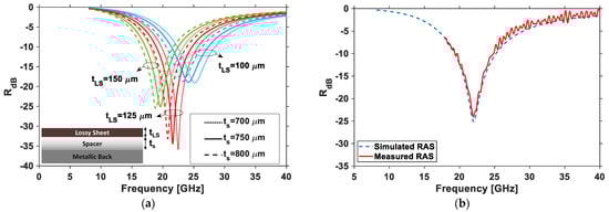 (a) Reflection as a function of different combinations of spacer and lossy thicknesses. (b) Comparison between measured (red line) and simulated (dashed blue line) reflection coefficients of RAS with ts = 750 µm and tLS = 120 µm.