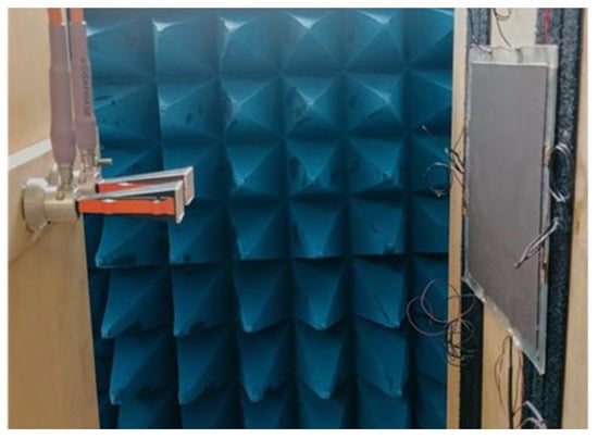 In addition to SHM systems, in the aerospace industry there is also a considerable interest in the control and suppression of electromagnetic interference (EMI) issues caused by natural events such as lightning, or by the interaction between electrical devices such as antenna and communication systems [21,22,23]. Moreover, the continuous research into innovative solutions in the electromagnetic compatibility (EMC) field has pushed towards the design and development of smart materials and structures able to reduce EMI at radio frequencies. In this context, significant investments come from the defense industry with the aim of studying multifunctional materials able to reduce radar cross section (RCS) and aircraft observability [24] as well as EMI. In the recent literature, Kutluhan et al. [25] investigated the use of nanoparticle-based materials in order to design different solutions to minimize the reflection coefficient and widen the EM absorption bandwidth (BW) at −10 dB. Specifically, they proposed one solution providing a minimum value of the reflection coefficient equal to −28 dB at the frequency of 10 GHz and a second solution with a maximum bandwidth at −10 dB equal to 3 GHz. Taufiq et al. [26] designed a nanostructured material based on Fe3O4/MWCNT/ZnO for EMC applications in the frequency range between 7 GHz and 13 GHz. The developed sample, having a thickness of approximately 5 mm, was characterized by a central frequency of 10 GHz and an absorption bandwidth (at −10 dB) of 4 GHz. Moreover, Puthucheri et al. [27] proposed a nanostructured nickel-ferrite EM absorber having a total thickness of about 2 mm and a minimum reflection coefficient of −40 dB with a central frequency of 10.3 GHz and a BW at −10 dB of 4 GHz.