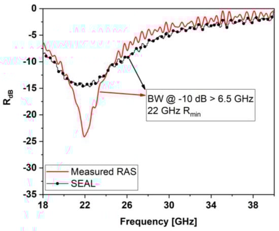 As described in Section 2.2, a RAS was produced, with ts = 750 µm and tLS = 120 µm, and glued onto an aluminum back. The reflection coefficient of the panel was measured in free space using two rectangular antennas in bistatic configuration and connected to a vector network analyzer (Agilent N5245A PNA-X). The results, shown in Figure 17b, demonstrate the good agreement between the values of the reflection coefficient for the simulated absorbing panel (dashed blue line) and the produced prototype being tested (red line). It can be also observed that the minimum reflection coefficient was about −25 dB at 22 GHz and the bandwidth at −10 dB was around 6 GHz.