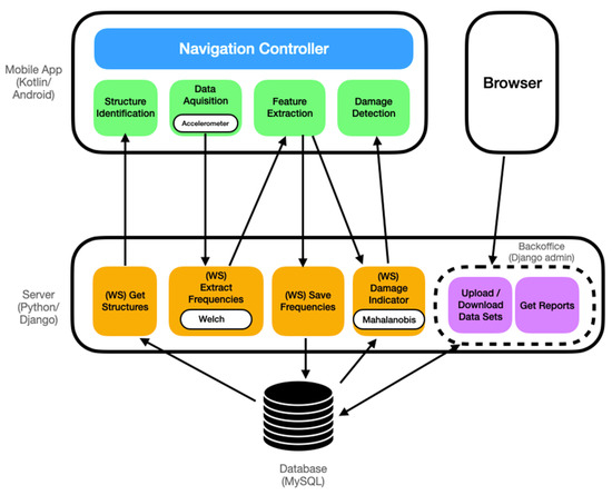 The application is composed of two software components: a mobile application and a computational platform hosted by the server. The mobile application is developed in Kotlin and is compatible with devices running Android 10 operating system (or higher). It implements a navigation mechanism with four tabs (represented by the green boxes in Figure 2), corresponding to the four steps in the damage detection process: