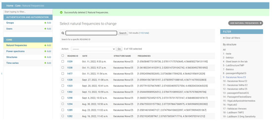 The application is linked with a Python/Django server through REST webservices to get existing structures, perform calculations, and save the measured structural frequencies in a MySQL database (orange boxes in Figure 2). There is also a web interface (Figure 3), accessible with any browser, providing a backoffice (automatically generated by Django admin) which allows users to manage all the information stored in the database: structures, time series, power spectral densities, and natural frequencies. Using this interface, users with administrator’s privileges may access all monitoring information, including accelerograms, power spectral densities, and extracted frequencies. It is also possible to upload previously recorded observations, register new structures, and delete incorrect data sets, among other operations. This architecture has the following benefits: