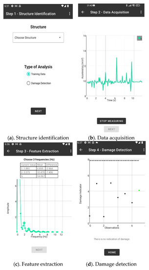 The damage detection step applies a Mahalanobis-based algorithm to detect abnormal observations by measuring the distance between the previously recorded frequencies and the current observation. This results in a set of damage indicators (DI), which is transmitted to and shown in the mobile application (Figure 4d). If the damage indicator is superior to a threshold defined for a level of significance of 5% of a chi-squared distribution, the application raises a red flag and outputs a warning message. Otherwise, App4SHM raises a green flag, as no damage indication is present. The 5% level of significance is a common choice in the literature (e.g., [26]), as it strikes a good balance between the risks of the algorithm yielding false positives and false negatives. However, the level of significance can be easily changed programmatically, if needed.