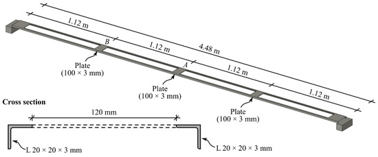 The steel beam, illustrated in Figure 5, was composed of two equal leg angles (L 20 × 20 × 3 mm) connected at given intervals by 100 × 3 mm plates to ensure that a global flexural behavior is achieved. The steel beam was simply supported with a free span of 4480 mm.