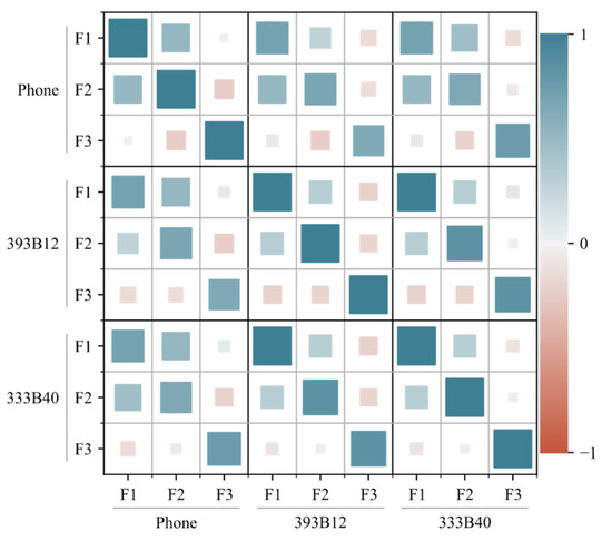 Additionally, a correlation test was made to verify if the natural frequencies computed resorting to the conventional accelerometers and smartphone are linearly related to each other. Figure 7 depicts a matrix with the correlation heatmap, where the size and color intensity of the square are proportional to the correlation’s magnitude, while the color itself separates the negative and positive correlations. A strong positive correlation is attained between the conventional accelerometers, with correlation values between 0.84 and 1.00 obtained when comparing the same frequencies. The correlation values between the smartphone and the accelerometers are smaller (between 0.63 and 0.76), but still strongly positive. Lastly, if one compares different frequencies, regardless of the considered accelerometer, only small correlations were observed as suggested by the off-diagonal entry values.