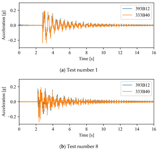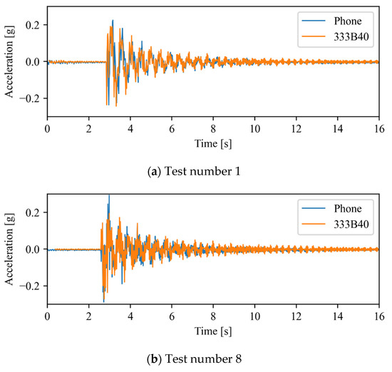 Figure 9 depicts the time series obtained using the smartphone and the 333B40 accelerometer. The signals have a good general agreement, presenting only a limited number of small differences. Resorting to the cross-correlation method in order to synchronize the time series, correlation values of 0.71 and 0.55 were achieved for tests number 1 and 8, respectively. These values are considerably lower than those obtained for the time series measured with conventional accelerometers. This is caused by the relatively poor sensitivity of the smartphone’s accelerometer as compared with professional equipment. However, despite the difference between the time series, their frequency content is remarkably similar, as shown in the next section.