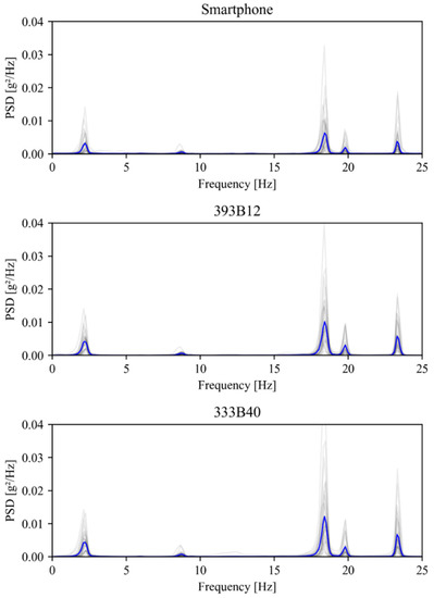 The entire set of time series obtained during the experimental study was used to compute their respective power spectra, which were determined using the Welch algorithm. Figure 10 illustrates all power spectral densities in grey lines, along with their averages, in blue lines, for the smartphone and conventional accelerometers. Similar to that reported in Table 1, the analysis of Figure 10 reveals a low variability in terms of natural frequencies, i.e., the local maxima, regardless of the considered accelerometer.