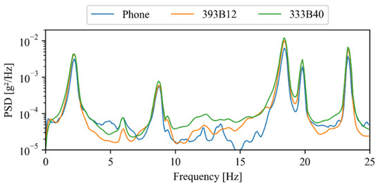 Additionally, Figure 11 depicts the average power spectral densities (using a logarithmic scale) obtained with the three devices, which exhibit an excellent agreement concerning the structure’s natural frequencies. Moreover, in order to compare the entire frequency range of the power spectral density, a cross correlation analysis was performed. This analysis yielded correlation values of 1.00 and 0.99 between each accelerometer and the smartphone, which reveals an excellent agreement between the considered power spectral densities.
