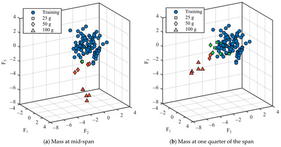Five dynamic tests were executed for each mass/location combination and the first three natural frequencies were extracted for each case, yielding the squares, diamonds and upper triangles illustrated in Figure 12. Note that the marker indicates the amount of mass added to the steel beam, whilst the marker’s color specifies if damage was identified by App4SHM (red) or not (green). Figure 12a, which illustrates the results obtained when the mass is placed at mid-span, shows that the first and (especially) third frequencies are the most affected, while the second frequency suffered no significant change. This is physically consistent, as the second natural mode of vibration has a node at mid-span, so should be less affected by an additional mass placed at that position. Figure 12 shows that App4SHM correctly identifies damage when at least one natural frequency deviates by more than two standard deviations from the training cluster.