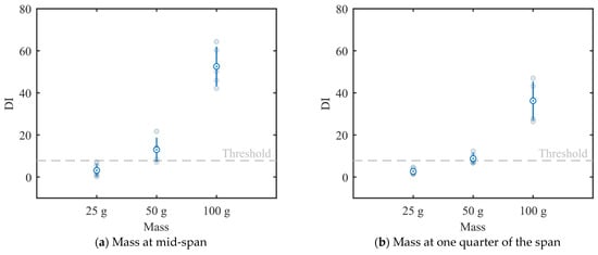 The evolution of the damage index (DI), defined by Equation (1), as a function of the added mass and its location is presented in Figure 14. Each cyan circular marker corresponds to a damage detection observation, the circle with a dot represents the mean DI, and the vertical lines indicate the ± standard deviation range. The DI threshold that separates undamaged from damaged data is shown as a horizontal line. The lowest added mass tends to yield higher DIs than the training data, but they always remain below the threshold. The 50 g mass is recognized as damage in most cases, especially when the mass is located at mid-span. However, the threshold is located at less than one standard deviation from the mean, so it is expected that the Mahalanobis-based algorithm would yield a considerable number of false negatives. Finally, the highest mass has a marked impact on the DI, with the measurements always located more than two standard deviations higher than the threshold. This means that false negatives should very seldomly occur for this level of added mass. Lastly, as expected, placing the mass at mid-span leads to larger DIs as compared to those attained with the mass at one quarter of the span.