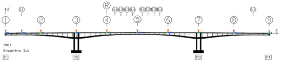 Ambient vibration tests were carried out in October 2021 on the two bridges to estimate the operational mode shapes, using a conventional sensing system composed of three-axis strong motion force balance accelerometers from GeoSIG. In previous tests carried out in 2018, nine checkpoints were used as shown in Figure 16. This time, additional checkpoints were added to increase the resolution of the mode shapes’ configuration, resulting in a total of 19 checkpoints. Checkpoints between sections 4 and 6 (see Figure 16) were designed to find possible cracks in that area. The checkpoint placed at section 4 was kept as a reference point throughout the ambient vibration tests. Each checkpoint is composed of one fixed accelerometer (reference) and two moving accelerometers.