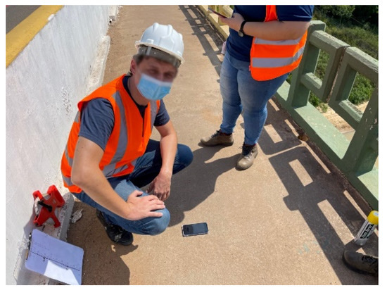 A comparative study was conducted resorting to measurements in section 2 (see Figure 16) of the new bridge using both sensing systems. As the smartphone measurements are obtained from a section where frequencies F2, F3, and F4 are best read, these frequencies are used for comparison. The smartphone was placed directly on the sidewalk as shown in Figure 17.