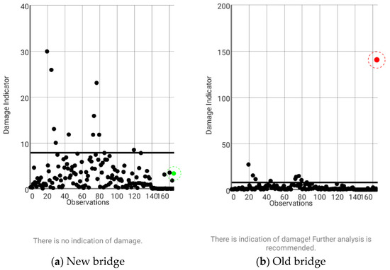 After the training step, two tests were performed independently on both bridges, using one observation from each bridge at section 5 and the training database from the new bridge only. The markers in Figure 18 show the DI for each observation obtained from the new and old bridges against the threshold defined for a level of significance of 5%. As expected, the results show that the observation from the old bridge is not statistically similar to the training data from the new bridge, giving an indication of some anomaly and recommending further analysis to discover the source of such outlier (the observation in red is highlighted inside a red circle, in Figure 18b). Conversely, the observation from the new bridge ranks below the threshold and no damage warning is issued (the observation in green is highlighted inside a green circle in Figure 18a).