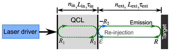 Terahertz (THz) quantum cascade lasers (QCLs) have undergone rapid development since their demonstration in 2002 [1], showing high emission power [2], quantum-limited linewidth [3], ultra-broadband gain [4,5], and being able to operate at high temperatures of up to 250 K in pulse mode [6]. Due to the absence of the relaxation oscillations and the small linewidth enhancement factor in the THz QCLs, it was widely accepted that THz QCLs are ultra-stable against optical feedback [7,8]. Recently, we reported the first observations of self-pulsations in a single-mode THz QCL [9] and demonstrated THz imaging with a fixed-current point THz QCL by using the self-pulsation phenomenon [10] and the modulation effects of the self-pulsation dynamics on the self-mixing waveforms [11]. It was observed that the self-pulsation phenomenon caused by the beating of the external cavity modes occurs under strong feedback regimes. In this condition, there is more than one round-trip reflection and propagation of the laser beam in the external cavity due to the non-perfect reflection coefficient of the laser facet. This is illustrated in Figure 1 for a QCL under optical feedback; the blue arrow indicates the reflection of the THz beam at the outside of the laser facet when it is trying to return to the laser cavity after being reflected from the target (with the reflection coefficient ). That is the start of the subsequent multiple round trips in the external cavity.