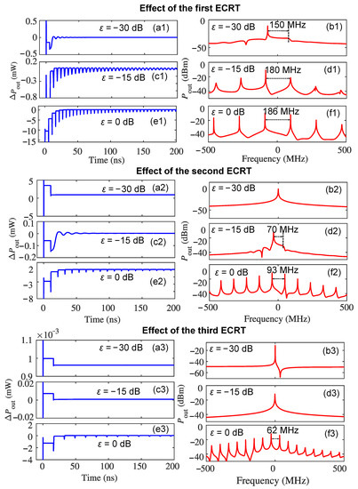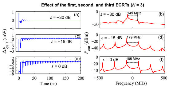 Once we have understood the effect of each individual ECRT on the self-pulsation dynamics separately, we now demonstrate the overall effects of N ECRTs simultaneously on the self-pulsations and determine how many ECRTs are needed to be involved in the theoretical model to describe the self-pulsation properties under varying optical feedback strengths. The self-pulsation dynamics and the corresponding spectrum by considering the first and second ECRTs simultaneously () are shown in Figure 3, where (a), (c), and (e) are the AC component of the emission power , and (b), (d), and (f) are the emission spectrum when is −30 dB, −15 dB, and 0 dB, respectively. Compared with the results in Figure 2 with the first ECRT only, it was found that the self-pulsation waveform when N equals to 2 is very similar when is −30 dB and −15 dB, respectively. However, when is 0 dB, the time-domain waveform when is distinct from that with the first ECRT only, which comes from the additional phase shift of from the 2nd ECRT due to < 0. Nevertheless, the emission spectrum of the complex field envelope when is still dominated by the effect of the first ECRT as shown in Figure 3, where the oscillation frequency of the self-pulsations with at −30 dB, −15 dB, and 0 dB is 149 MHz, 179 MHz, and 185 MHz, respectively, which is only a 1 MHz difference compared with the corresponding result shown in Figure 2(d1,f1).