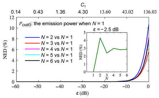 For the purpose of showing the NED estimation changes with multiple ECRTs relative to the first ECRT when , we use the emission output power with the first ECRT only () as the reference , and the of the emission output power when , 3, 4, 5, and 6 from is calculated as a function of and as shown in Figure 5. As expected, the for all N increases with the optical feedback level . At a fixed , such as −2.5 dB, it was observed that the value of repeats the alternating of a decreasing and increasing process when the round trip increases from 2 to 6, as plotted in the inset of Figure 5. The reason behind this phenomenon is that the feedback coupling coefficient and parameter are negative when N is an even number (2, 4, 6, etc.). This leads to an additional phase shift of of the returned beam, and the self-mixing between that particular returned beam and the existing beam results in more complicated self-pulsation waveforms as shown in Figure 3e, which increases the value of the corresponding .