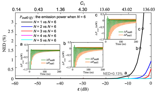 On the other hand, if using the emission output power when as the reference (which are the most accurate results under multiple ECRTs), the of the emission output power when and 5 from is calculated and shown in Figure 6 in the black, blue, red, cyan, and magenta curves, respectively. The higher the value of N, the smaller the value of as expected. In addition, in order to relate the value of with the self-pulsation waveform differences, three pairs of the time-domain self-pulsation waveform at Point a ( dB, ), b ( dB, )), and c ( dB, ) along the black curve (when ) are chosen and shown in inset a, b, and c in Figure 6, respectively. The green and orange curves in each pair of the inset are the AC component of the reference emission power () and that with N equals to 1 (), respectively. The values at Point a, b, and c are 0.13 %, 1.26 %, and 2.28 %, respectively. When the strength of the optical feedback grows, more ECRTs have to be involved, and the precise number of ECRTs is dependent on the acceptable NED. Because we can see the time-domain waveform between N = 1 and N = 6 starts deviating from Point a with NED = 0.13%, we used NED = 0.13% here as a threshold to show how many ECRTs have to be involved with a varying feedback level. As indicated by the dashed grey line in Figure 6, we would need to consider two and three ECRTs when the optical reinjection coupling coefficient is larger than dB and dB, respectively.
