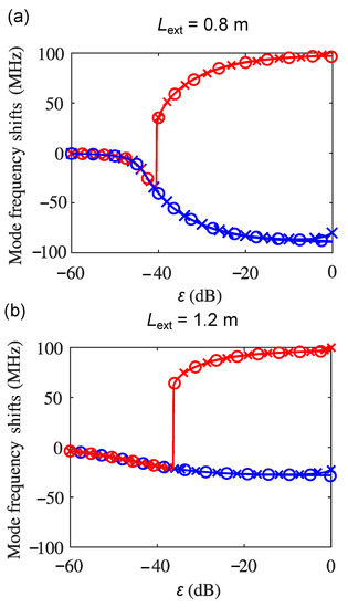 Furthermore, we solved the excess-phase equations with multiple ECRTs simultaneously when and 3, and the mode frequency shifts of the fundamental mode and the first-order external cavity mode with under these three conditions are shown in solid lines, solid line with cross markers, and the solid line with the circle markers, respectively, in Figure 8, where (a) depicts the results with at 0.8 m and (b) shows the results for of 1.2 m. It can be found that the phase solutions of the fundamental mode and the first-order external cavity mode when and 3 are nearly overlapping with the results when . This further proves that the self-pulsation dynamics in the frequency domain (due to frequency splitting) obtained from the first ECRT are dominant in the results with more than one ECRT. Because there is only one type of the optical feedback dynamics that was observed in the THz QCLs, namely the self-pulsation dynamics, the relevant conclusion does not change with the external cavity length, as shown in Figure 8b.