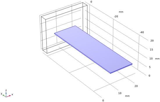 Based on the theoretical analysis method in Section 2, a vibration energy harvester based on PVDF piezo-film was designed and modeled in COMSOL Multiphysics software, as shown in Figure 4. Then, the main body’s mechanical and electrical parameters of material input a parameter matrix in the software simulator are shown in Table 1. The mechanical clamping mode of the main body is set as single-end fixation, the upper and lower surfaces of the main body are output as electrodes, and corresponds to the LE vibration model and simulated boundary condition: mechanical clamping and an electrical short circuit. The vibrational incentive sources are set according to the parameters of the motor testing signal. When the cantilever beam of PVDF material reaches the first order resonance under this vibration excitation, the system frequency response solver in the software output with the dimensions of the main structure is 46.4 × 13.21 × 0.4 mm3.