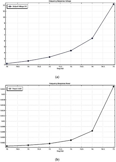 When applying a body load to this model with the same vibration parameters as the motor, i.e., a uniformly distributed loading stress that production from a modulator in software by the vibration sources with a frequency of 75 Hz and acceleration amplitude of 2.198 g, the output voltage and power at the harmonic response was obtained, as shown in Figure 5. Under the resonance frequency of 75 Hz, the output voltage and power of the harvester model were 12.67 V and 23 µW, respectively.