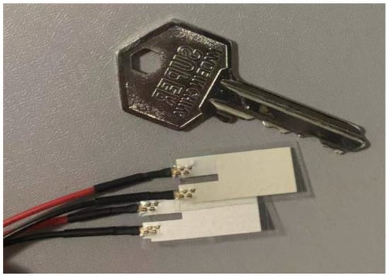 Then, the films were embedded in screen-printed silver ink electrodes, laminated to a 125 µm polyester substrate, fitted with two crimped contacts, and packaged in a flexible plastic cover. The electrode of the upper and lower surfaces is led out by copper-core DuPont wires. The physical product of the piezoelectric thin film manufactured by us is shown in Figure 6. When in use, it can be fixed either at one end or by lamination.