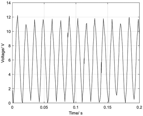 First, the VEH based on a piezoelectric thin film was stuck on the motor shell to capture the vibration energy and measured its output with a multimeter and oscilloscope at the same time. In Figure 7, the oscilloscope shows the relationship between the output open voltage of the rectifier and time. The output peak voltage was approximately 12 V. Additionally, the output short-circuit AC current measured was 0.061 mA.