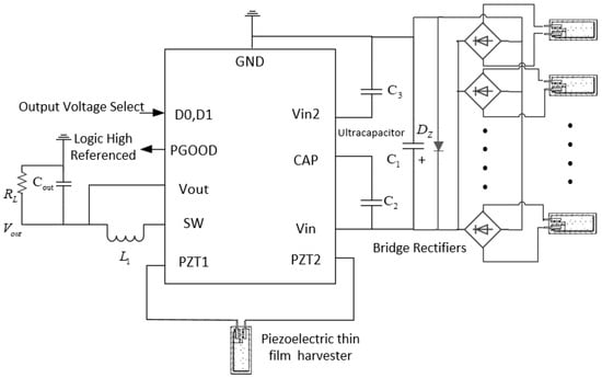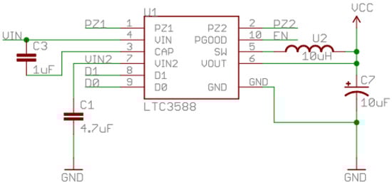 Then, a vibration energy harvesting circuit based on the LTC3588-1 power management chip was built according to the peripheral circuit of Figure 8. The electrode output of the VEH is connected to the pz1/2 pins, and the VIN pin is connected to an energy storage element. The remaining capacitors and inductors are designed to trigger internal logic control [].