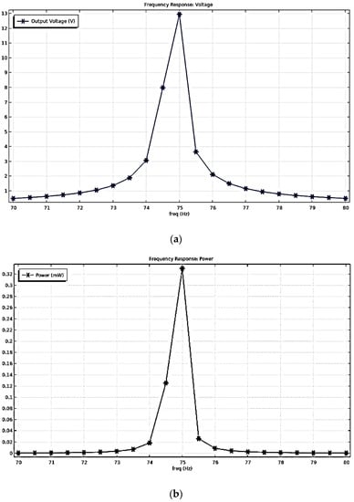 Simulation Results of the Harvester under the Motor Vibration Excitation: (a) Frequency Response of the Output Voltage; (b) Frequency Response of the Output Power.