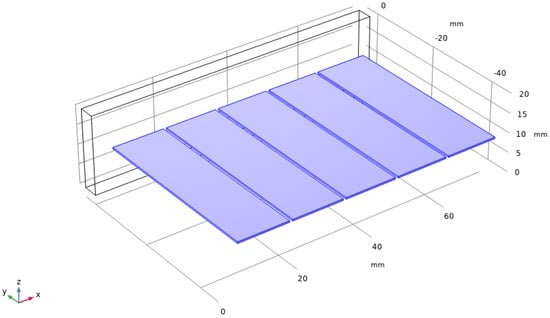 Similar to the theoretical analysis and modeling approaches for the single film harvester in Figure 4, a multi-piezoelectric film planar array-based vibration energy harvester was built in COMSOL, as shown in Figure 13. Above all, the mechanical input of each piezoelectric transducer unit in the array has been uniformly set when the model is established, and the input vibration signals are completely consistent. The output of each piezoelectric transducer unit is virtually electrically coupled, and they output power on the global variable impedance.