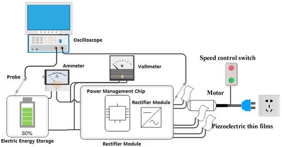 In order for the vibration amplitude of each piezo film to be the same and the time difference of sensing vibration to be the shortest, five pieces of piezoelectric thin film stuck to the surface of the motor housing, side by side, without overlapping. The equipment setup for the testing of vibration energy harvesting is shown in Figure 15.