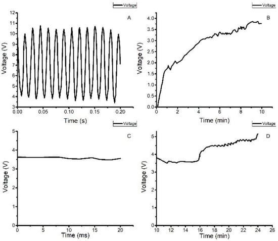 Voltage Waveform in Charging Experiment: (A) Rectifier Output Wave; (B) The Voltage Waveform of the Supercapacitor in 0–3.5 V; (C) The Output Voltage of the Vibration Energy Harvesting Circuit; (D) The Voltage Waveform of the Supercapacitor for 3.5–5 V.