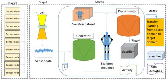 Referring to the operations of the first two stages, a GAN is capable of producing a sequence of synthetic skeletons, consisting of a generator that attempts to capture the distribution and a discriminator that assesses the generator output and penalizes unrealistic samples. It is a network architecture that is trained to achieve an equilibrium. We receive sensor data from VAEs and then feed the data into GANs in order to generate entirely new and realistic skeleton maps that match the distribution of a given target dataset. The architecture for the proposed GAN model is illustrated in Figure 5. The generator yields a sequence of skeleton as the input of the discriminator. Uniquely, our approach utilizes a conditional GAN to generate a sequence of verisimilar skeletons from individuals on different activities. A small amount of sensor data of individuals are trained as labeled data with respect to the human activities. Given multiple sensor data of an individual, the generator tries to create a corresponding skeleton map for data augmentation. We train a sequence of the skeletons so that inferred skeletons are similar to real ones. Thus, the skeleton map derived from the generator is applied to distinguish the human activities by a discriminator.